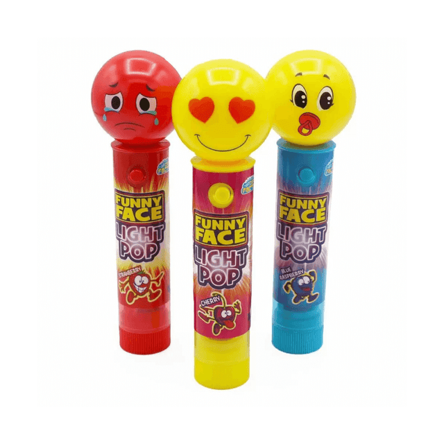 Funny Face Light Pop are supplied by Craczy Candy Factory.These come packed in a box of 12 Count each sweet weighs 11g.These are a hard sweet candy lollipop these come in a plastic tube with a round ball with a smiling face on top and when pressing a button on the side it lights up the round ball on top.These Funny Face Light Pops come in cherry,strawberry and Blue Raspberry flavours.These are not suitable for children under 36 months.(ALLERGY ADVICE these may contain SOYA)These Funny Face Light Pop are available wholesale and can be brought at Appleton Sweets.