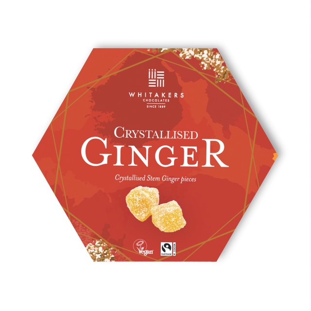 Ignite your taste buds with Whitakers Chocolates' Fiery Crystallised Stem Ginger, sugar-dusted and elegantly presented in a stunning hexagonal gifting box.